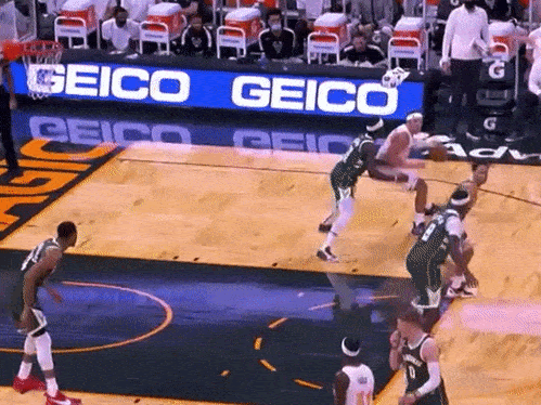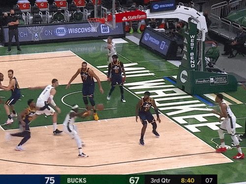 The Bucks move Jrue around the court like a queen on a chessboard. He creates open looks from the dunker’s spot, the corner, and from the top of the arc, orchestrating the pick and roll. When help defenders arrive, he flings passes over his head and behind his back. Here, he slips dimes in transition and lasers the ball with both hands.