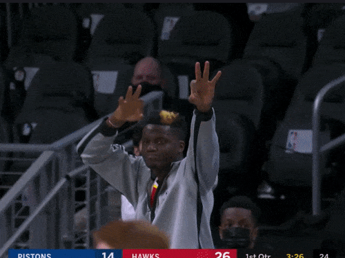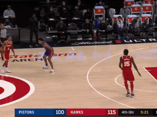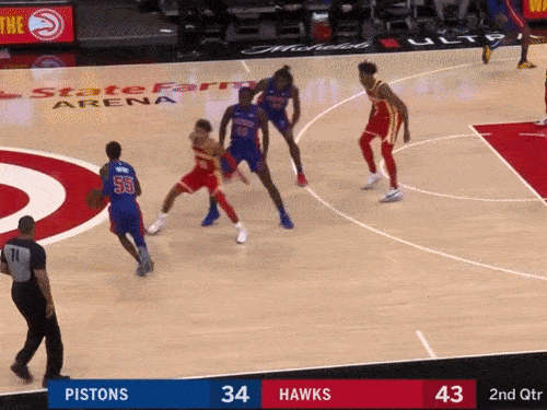 John Collins and Clint Capela set two screens for Trae going right. The Pistons defend it well: Killian Hayes avoids getting screened; Mason Plumlee shows high above the 3 point line to prevent a pull-up 3; Jerami Grant gets a touch on the rolling Capela to slow his momentum and is in position to close out to Collins; Saddiq Bey, the low man, is in the paint ready to pounce on a pass to Capela.