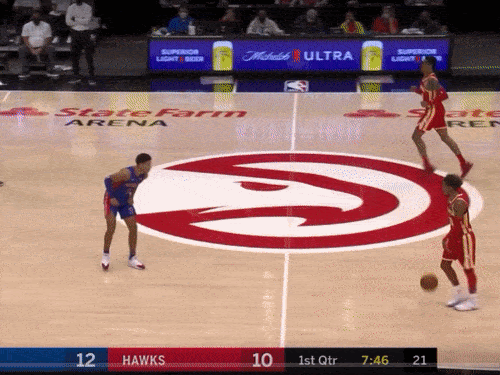 The defense recovers to their original assignments. As Collins rumbles over to set another screen, Trae attacks the rookie in isolation. He drives hard to the right, forcing Hayes’ momentum towards the baseline, and pulls the ball between his legs for the step-back 3. Cash.