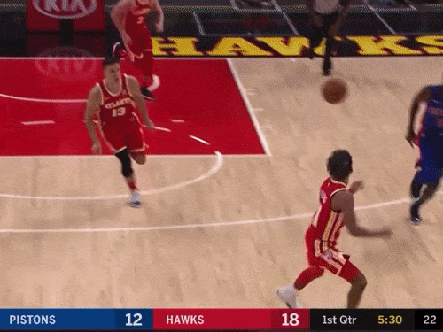 Trae receives a quick pitch and flows into a pick and roll with Capela. Capela slips the screen and his aggressive rim run sucks in Josh Jackson, the low man.