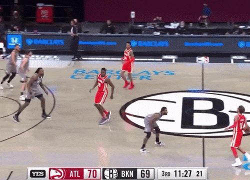 Trae attacks the middle going left off the pick and roll. Prince bumps down to Capela to deter the lob. We’ve seen this before. But instead of Reddish just chilling in the corner, he loops around to the wing and cuts down the lane. Trae gets him the ball with a head of steam, and the scrambling defense is forced to foul.